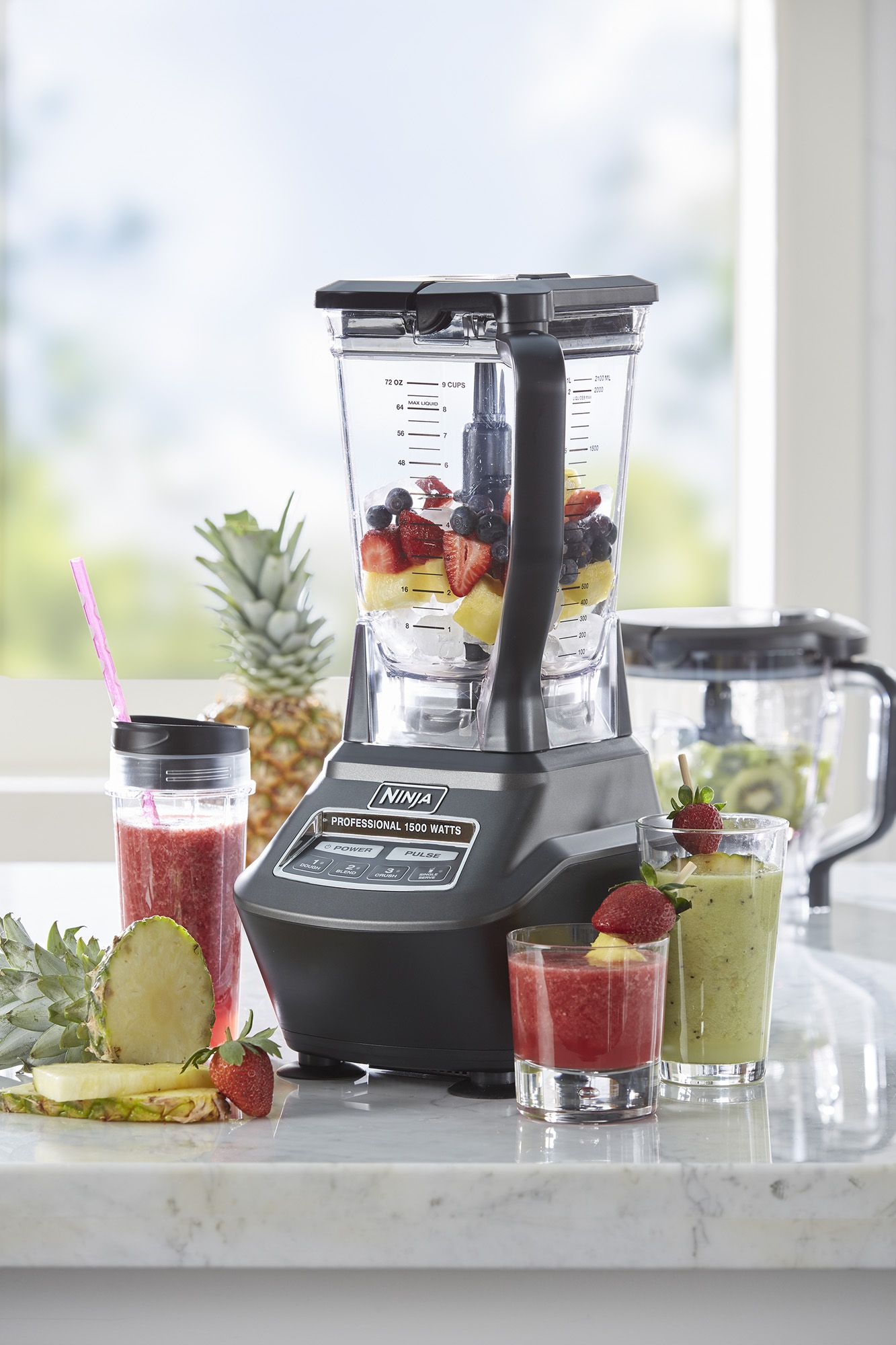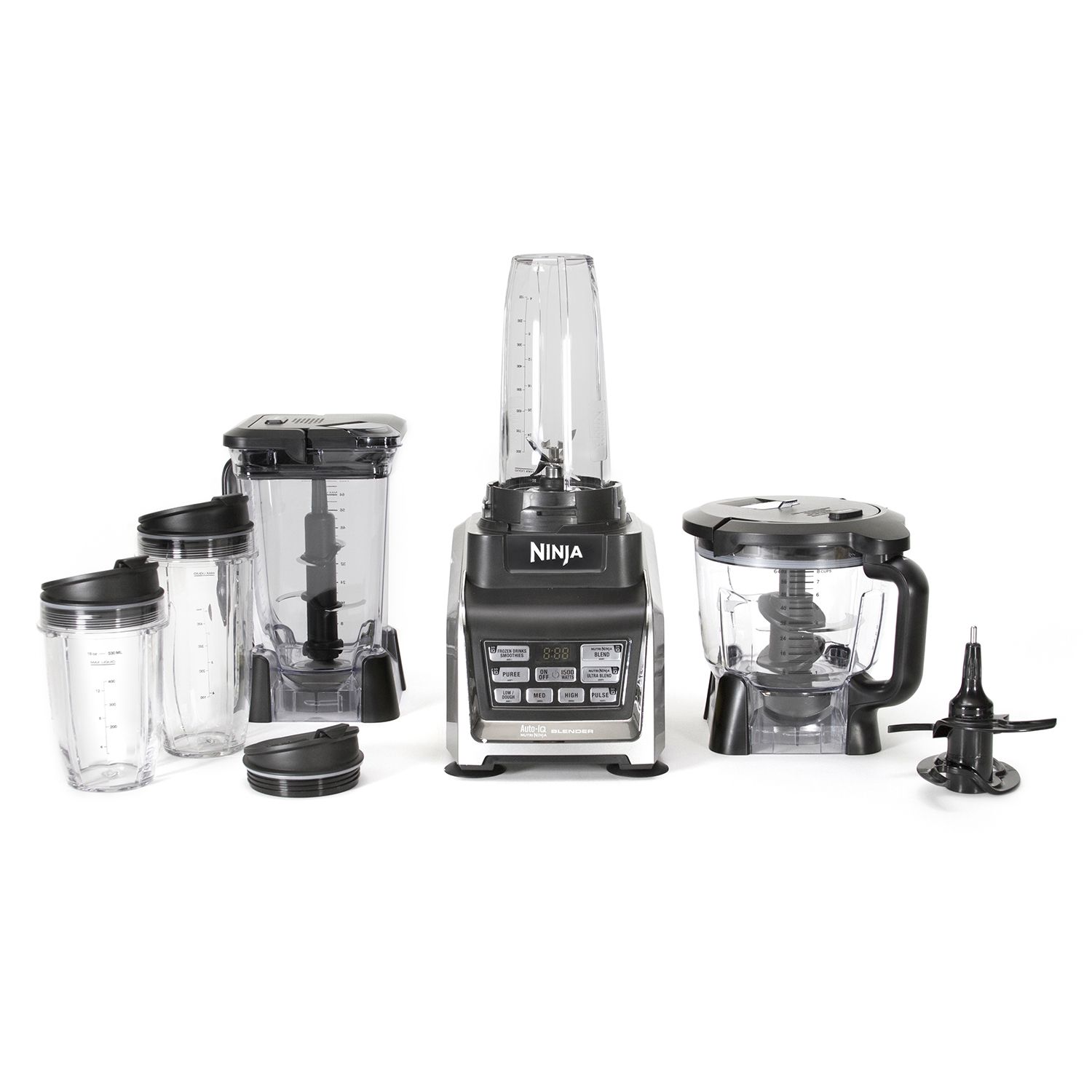 The Ninja Kitchen System with Auto-iQ has 1500 watts of professional power and performance. On your way to wellness. Jumbo Multi-Serve 32-ounce Nutri Ninja cup.