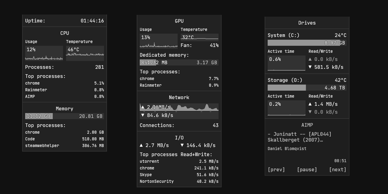 If you have any questions let me know. Here is my newest skin sysDash. Its an small and simple system monitoring skin which is completly modular.