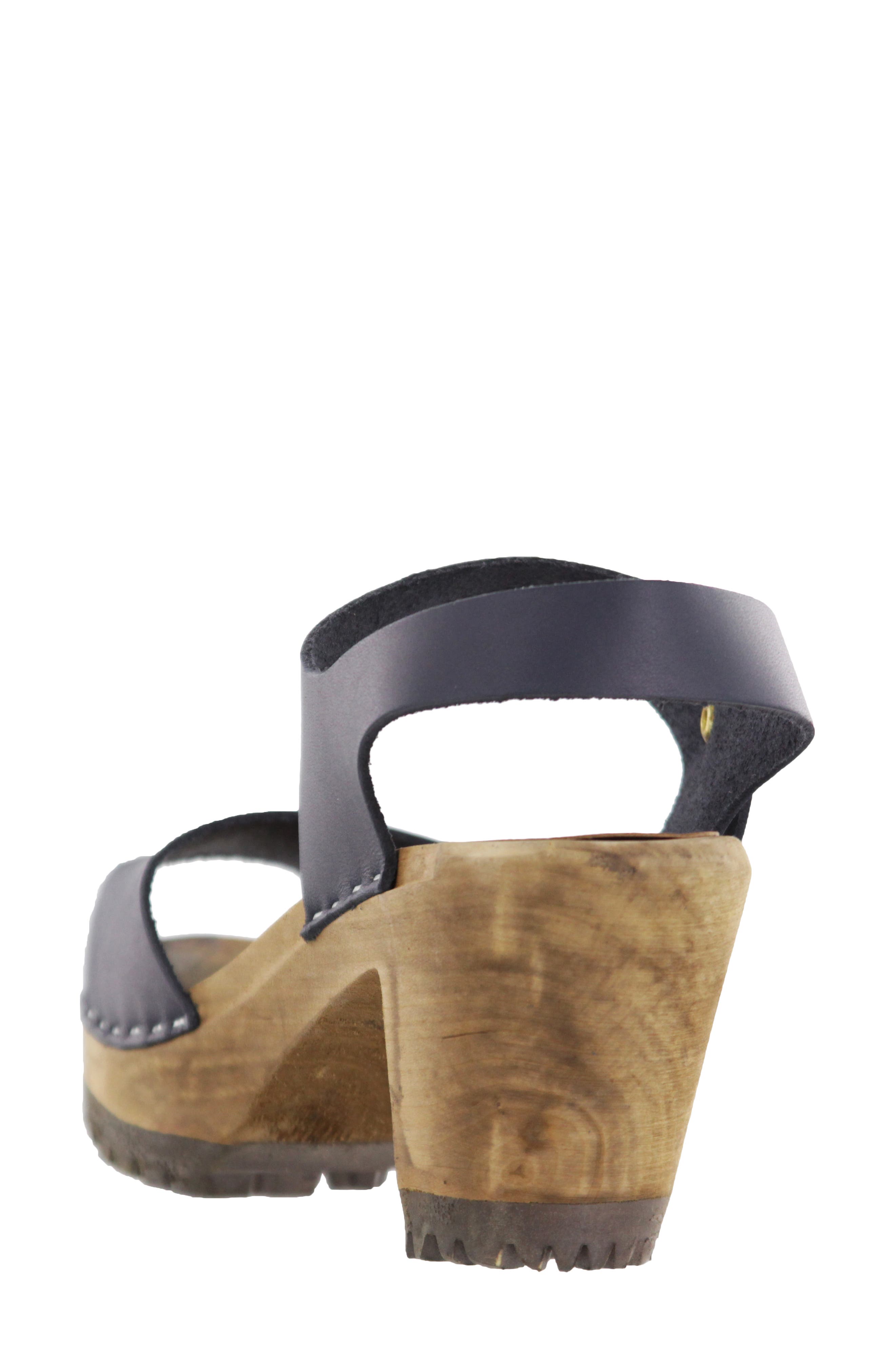 Greta clogs. Anatomically constructed footbed with arch support. These sandals are made on our natural Original wooden clog soles. Clog Sandal with an open toe front and ankle strap with buckle.